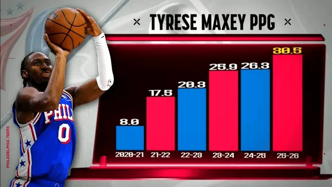 赛中,转播方晒出了马克西进联盟以来每个赛季的场均得分: